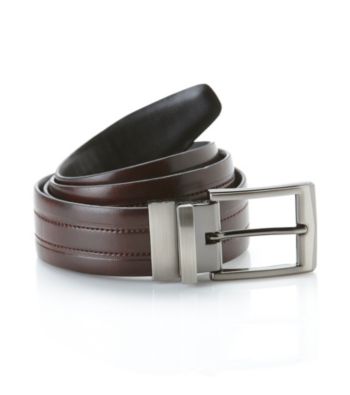 compare John Bartlett Statements Men's Reversible Belt - Black/Brown Men's Belts. Exclusively ours! Get ready for any dress or casual occasion with this reversible leather belt that features a silvertone buckle and heavy stitching. Simply twist the buckle to change between black and brown. Silvertone buckle with brushed finish Heavy stitching has classic style Square buckle Leather Imported