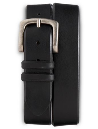Belts. A casual, flexible belt with beveled edges, double leather keeper and seven holes for a custom fit. Featured in black Black with brushed nickel harness buckle Brown with brass harness buckle 1" wide Leather Imported