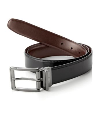 price comparisons of Perry Ellis Portfolio Men's Reversible Belt - Black/Brown Men's Don this classic reversible belt from Perry Ellis. Featuring textured black on one side and smooth brown on the other and a square-nose buckle; this full grain leather dress belt is both practical and stylish.