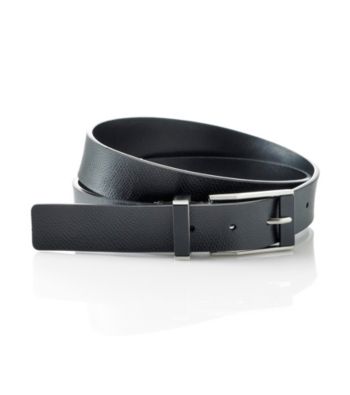 Belts. Add the perfect finishing touch to your outfit with a Calvin Klein belt! Creating a polished look is easy when you have the Calvin Klein Men's Black 32mm Flat Strap Leather Belt in your closet. Featuring a textured design on the strap and a silvertone roller buckle with a semi-covered keeper, this leather dress belt will be a definite style asset for your wardrobe. Black Non-reversible Leather Imported
