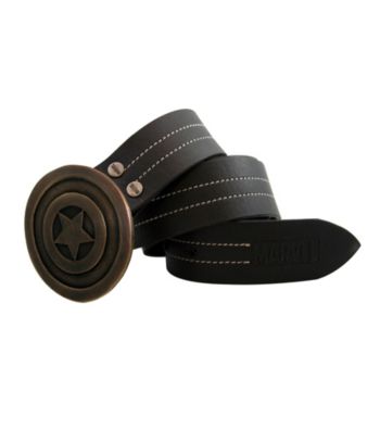 Belts. Web exclusive! Support your favorite Marvel character with this dynamic and stylish belt. Avengers assemble! The Marvel Men's Black Captain America Belt with Plaque Buckle ensures you re always ready to take on the worst the Red Skull can throw at you. 100% leather, this belt features a rounded plaque buckle that resembles the Captain s iconic shield, as well as contrast accent stitching and dual studs on the belt itself. It s finished with a Marvel leather stamp. Black 100% Leather Imported