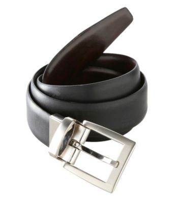Belts. Exclusively ours! A leather belt that reverses from black to brown for twice the style. Reversible is versatile. Polished finish keeps you looking sharp. Feathered edge provides casual comfort. Simple shaped buckle never goes out of style. Leather Imported