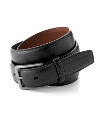 Belts. With graceful, contemporary lines, the black Sapphire belt from Perry Ellis features a feather-stitched edge, a smooth finish and a classic, gunmetal-tone buckle. Contemporary, black leather belt with feather-stitched edge Full-grain, saffiano cowhide finish Classic gunmetal-tone buckle Width: 32mm Leather Imported