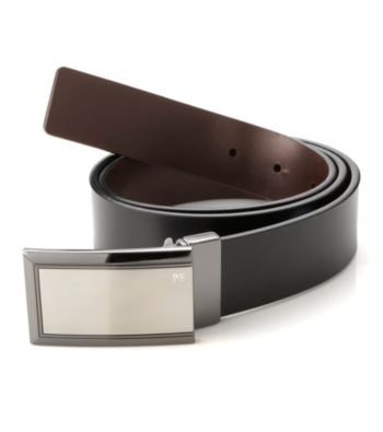 Belts. Graceful and ultra-contemporary, ensure a perfect match with virtually any outfit in this reversible, black/brown leather belt from Perry Ellis a men's must-have. Contemporary, reversible black/brown leather belt with cut edge 2-tone, gunmetal/brushed nickel swivel buckle Smooth cowhide finish Plaque on buckle Width: 35mm Leather Imported